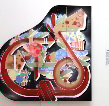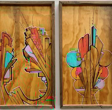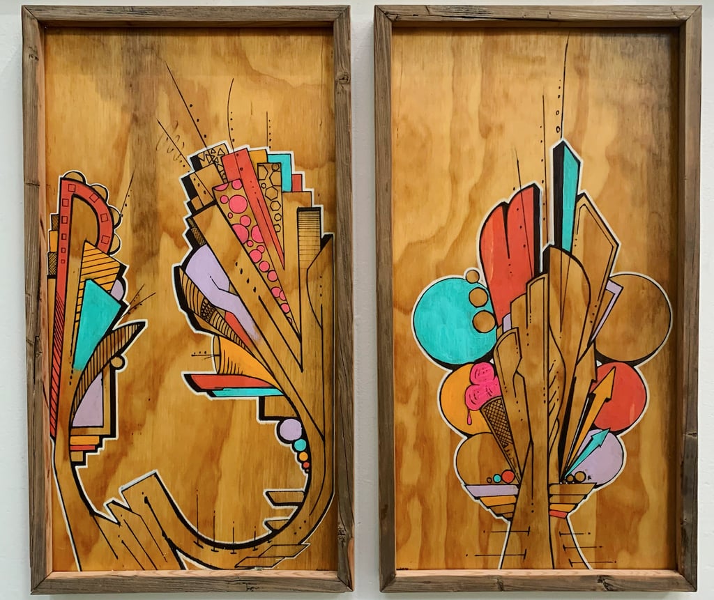 The triptych alone is worth your trip to The Fridge, if you ask me and deserves to be housed at a museum. Like all other works in the show, it is mainly painted on drift and found wood panels Apoxy collected from around the Anacostia River. The background of the piece evokes the feeling of cheap plywoods raised to fence abandoned lots, while colorful “flowers” of the painter contort and push upwards and outwards on the foreground. It is as close as you can get to the experience of looking at an outdoor graffiti in an indoor space, but then some. The triptych format suggests something akin to an altar piece, something specifically opened for view on sacred occasions of a metaphysical calendar. There is a real sense of divinity here but no scriptures to decode. “[I] had grown tired of both my name and, and letters in general,” Apoxy informs us and sure enough we see no words, no visible tags. Instead, it is an assembly of marvelous, pseudo geometric shapes, half recognizable objects, and emerging magical structures.